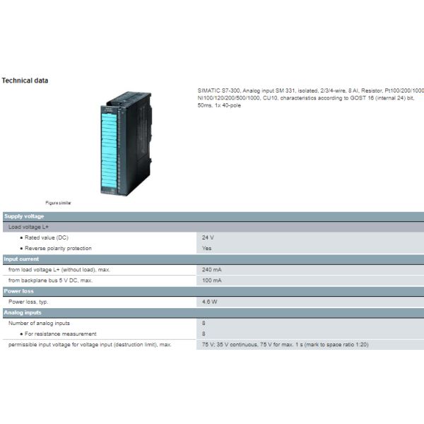 SIMATIC S7-300, Analog input SM 331, isolated, 2/3/4-wire, 8 AI, Resistor,
