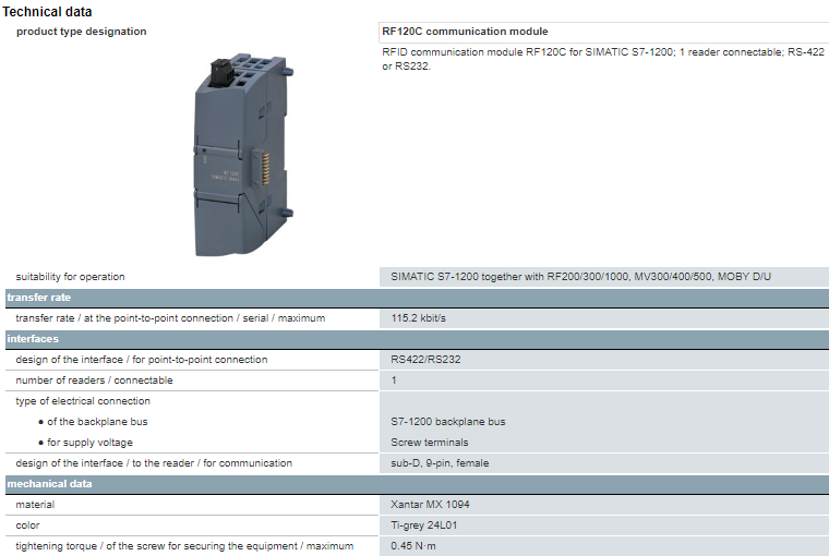 RFID communication module RF120C for SIMATIC S7-1200; 1 reader connectable; RS-422 or RS232.
