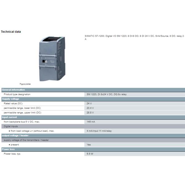 SIMATIC S7-1200, Digital I/O SM 1223, 8 DI/8 DO, 8 DI 24 V DC, Sink/Source, 8 DO, relay 2 A