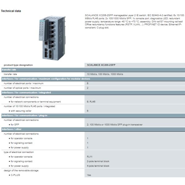 to +70 °C; assembly: DIN rail/S7 mounting rail/wall Office redundancy functions features (RSTP, VLAN,...); PROFINET IO device; Ethernet/IP-compliant; C-plug slot.