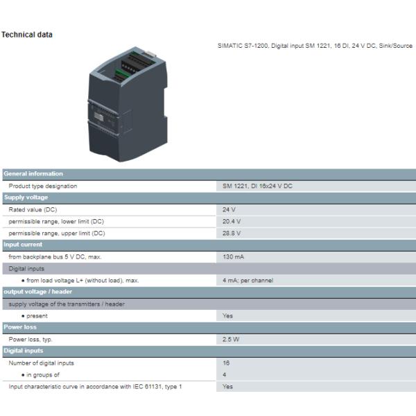 SIMATIC S7-1200, Digital input SM 1221, 16 DI, 24 V DC, Sink/Source