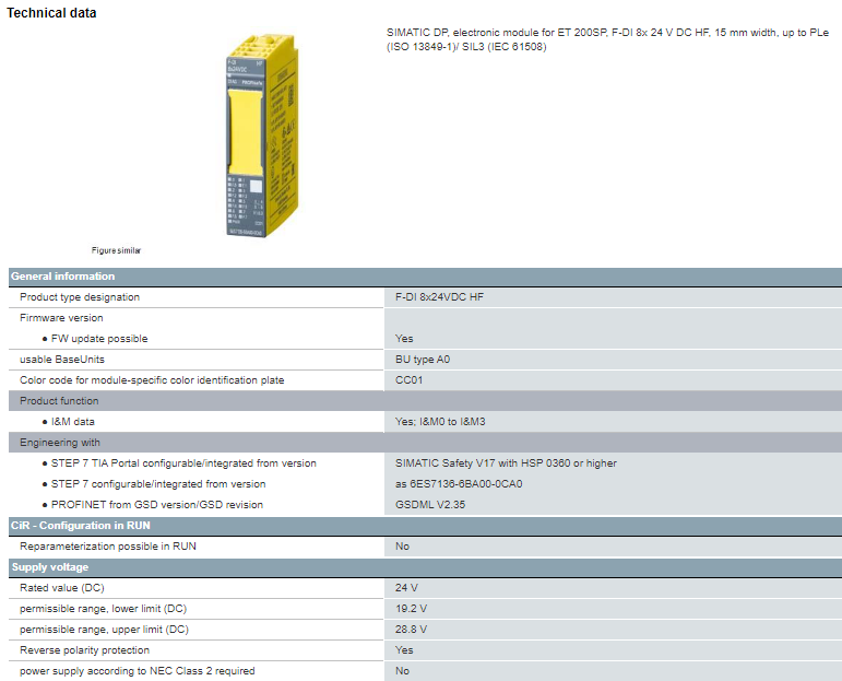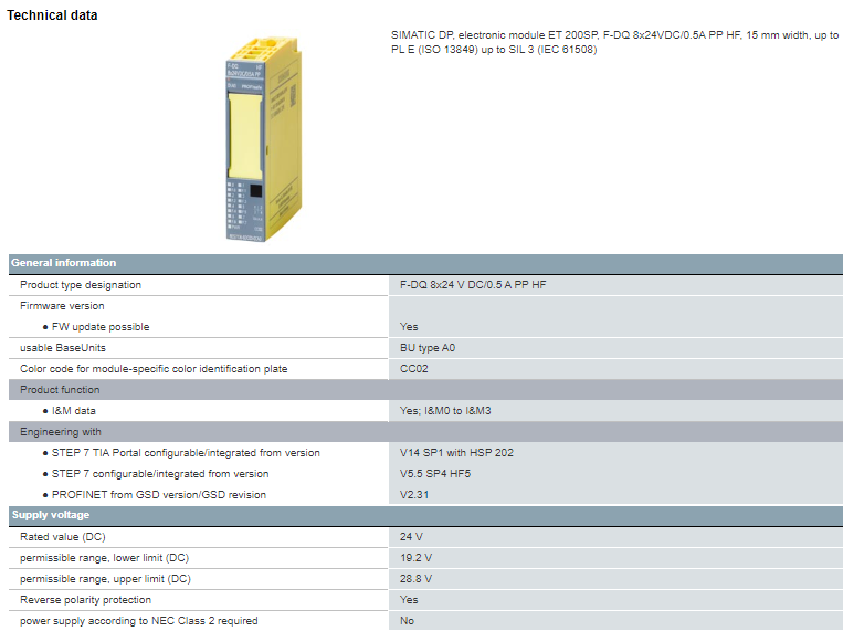 SIMATIC DP, electronic module for ET 200SP, F-DI 8x 24 V DC HF, 15 mm width, up to PLe (ISO 13849-1)/ SIL3 (IEC 61508).